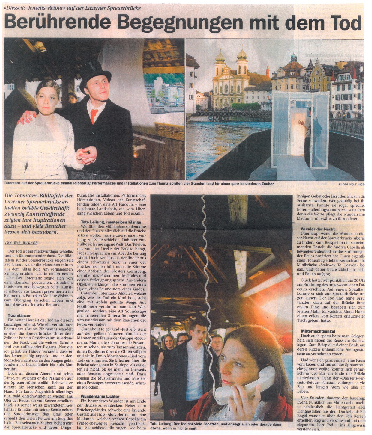 "Diesseits-Jenseits-Retour" war eine vierstündige Performance auf der Spreuerbrücke Luzern zum Thema Totentanz, bei der 21 KünstlerInnen aus allen Sparten mitwirkten.